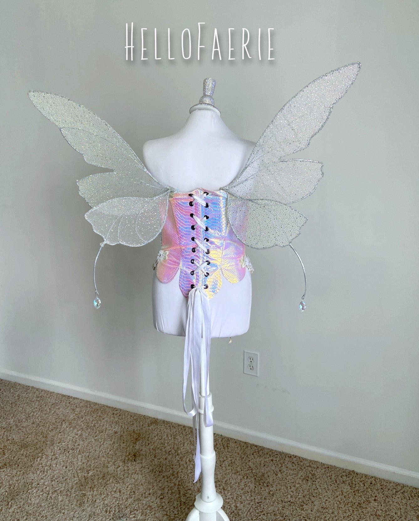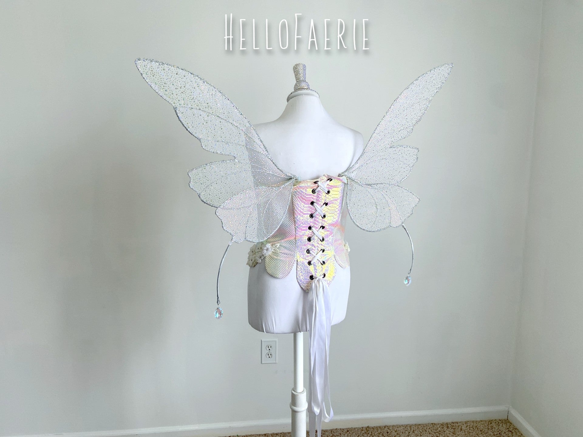 You can see even more videos and images of my wings on Instagram as well. <3 These wings are just over 2 feet in height and a 3 foot wingspan. They weigh in under a pound and are perfect for photo shoots and adventures. The wings are easy to wear, you just slide the base into the back of a corset, dress or tight fitting top. I am happy to add tie straps as well upon request.