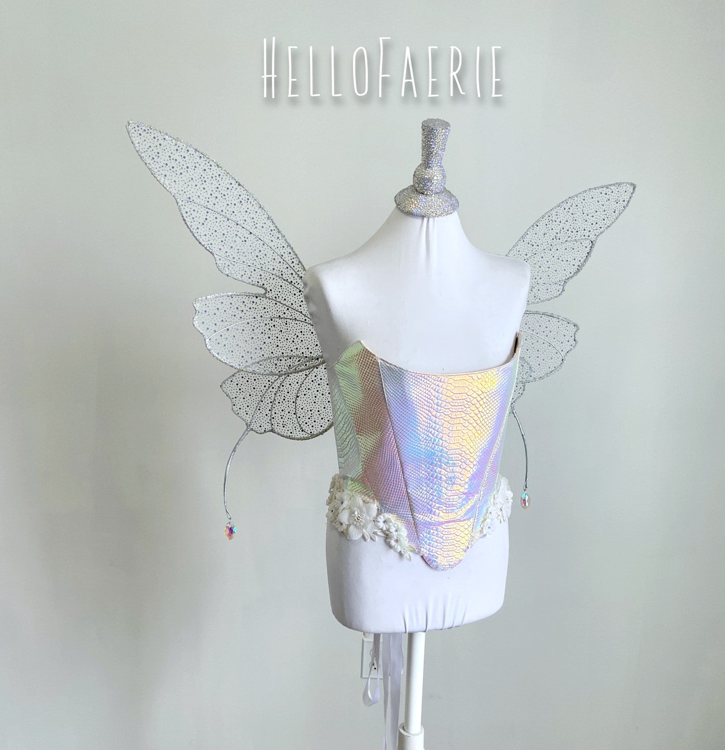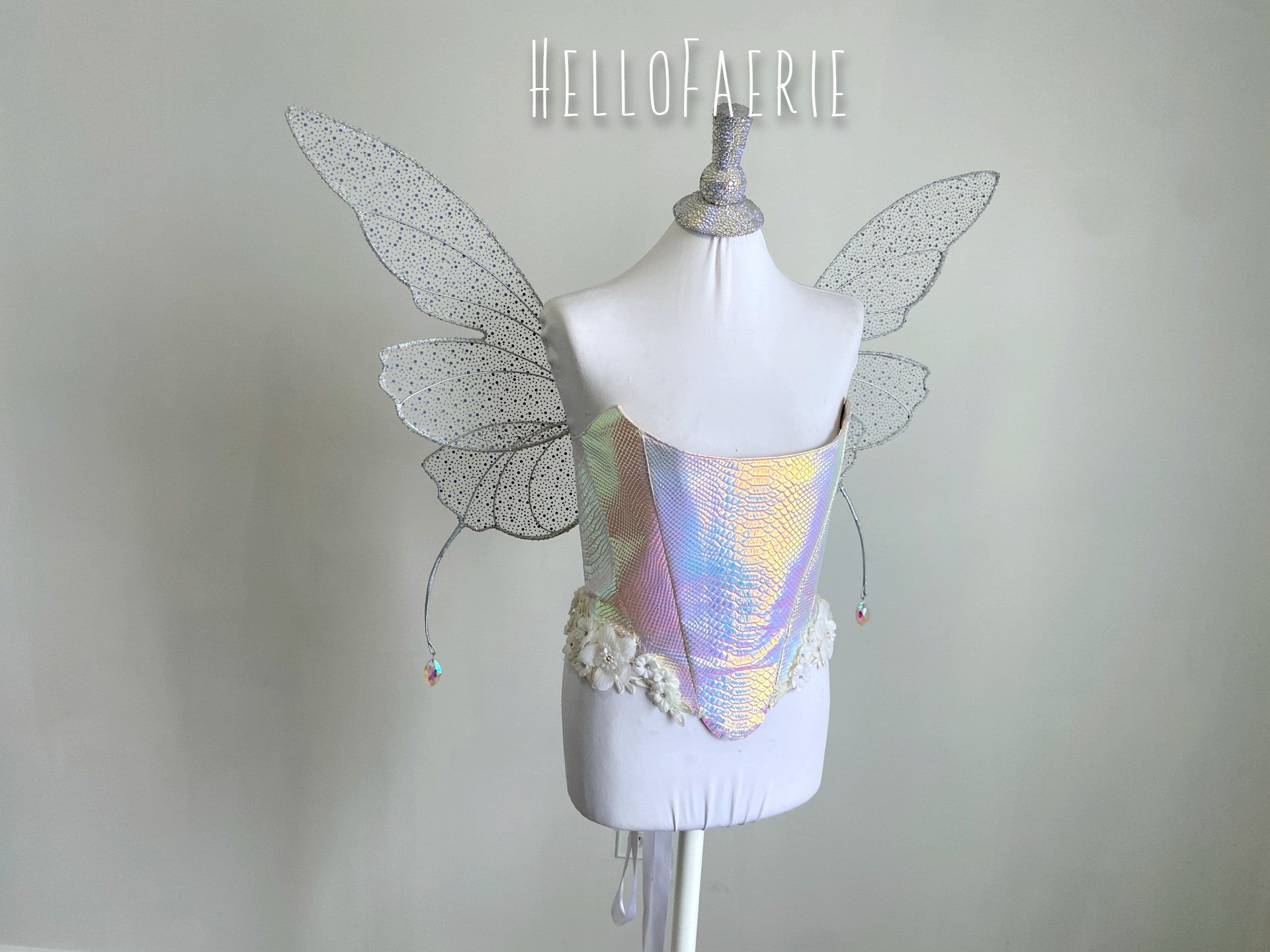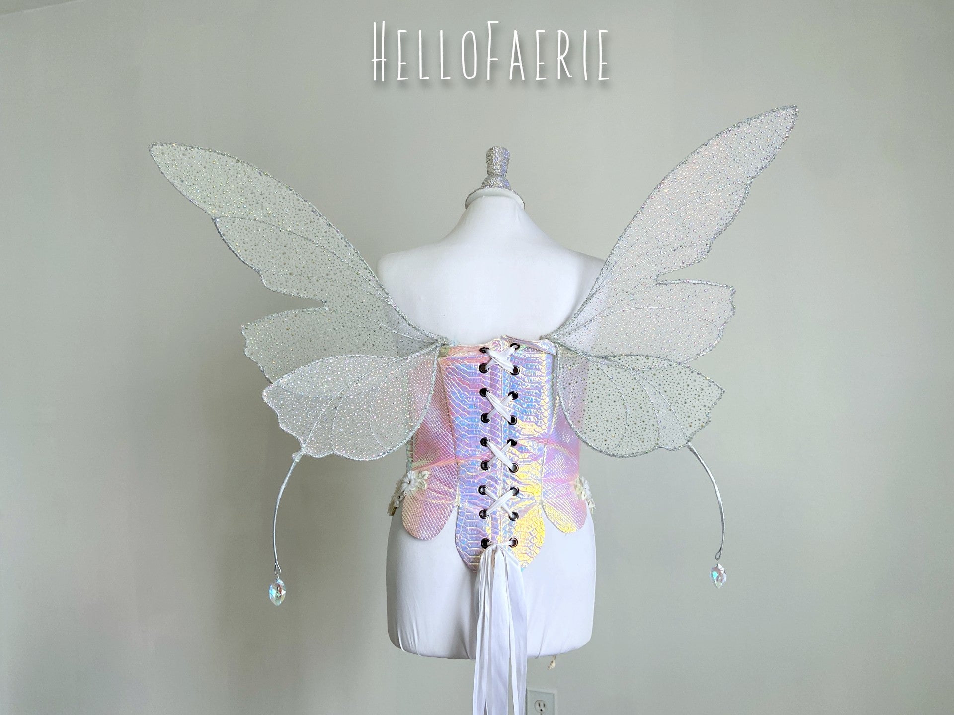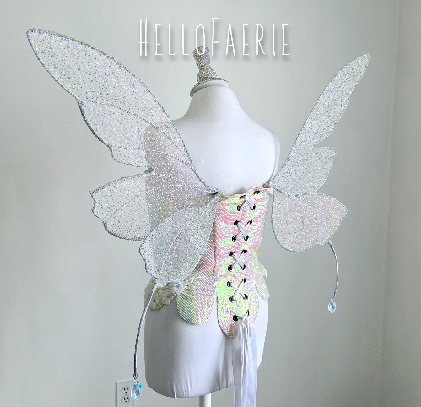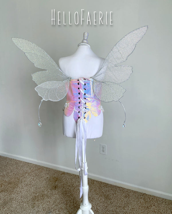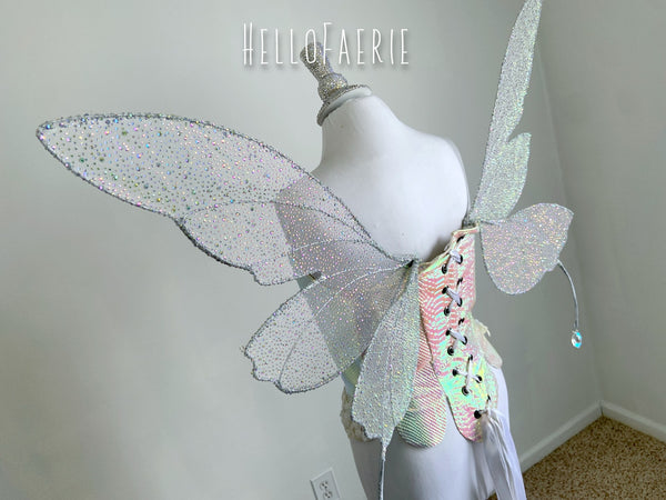 These wings have 4 wing panels, 2 on either side. Little tendrils adorn either side of the wings, growing slowly from the back with crystal drops. Hand sewn with rhinestone mesh, these sparkle like crazy.