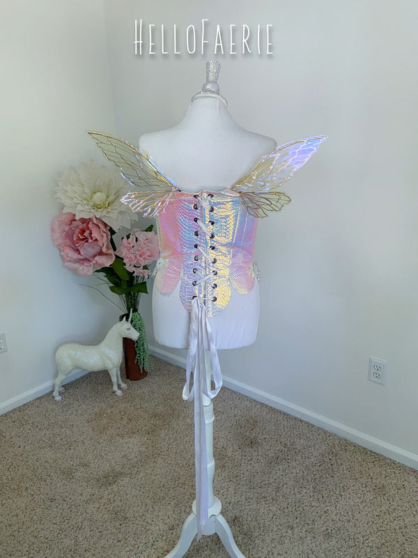 I am so proud and excited to rerelease my popular flexi fairy wings. Made of a durable plastic, they flex and bend without snapping. They are super light, and have the iridescent skin over them. These wings have a soft gorgeous flutter as you move and are the most unique wings I've ever seen.