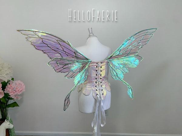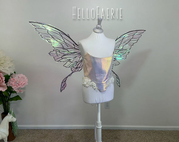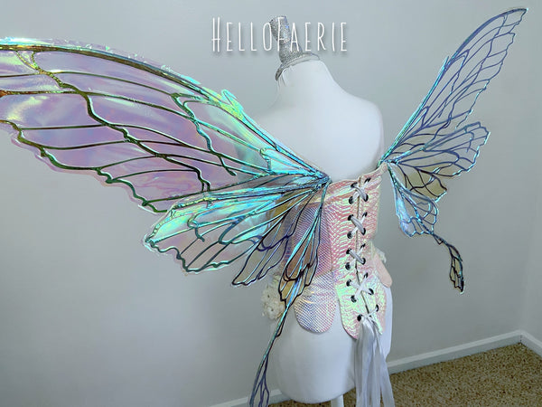I am so proud and excited to rerelease my popular flexi fairy wings. Made of a durable plastic, they flex and bend without snapping. They are super light, and have the wonderful iridescent film over them. These wings have a soft gorgeous flutter as you move and are the most unique wings I've ever seen.