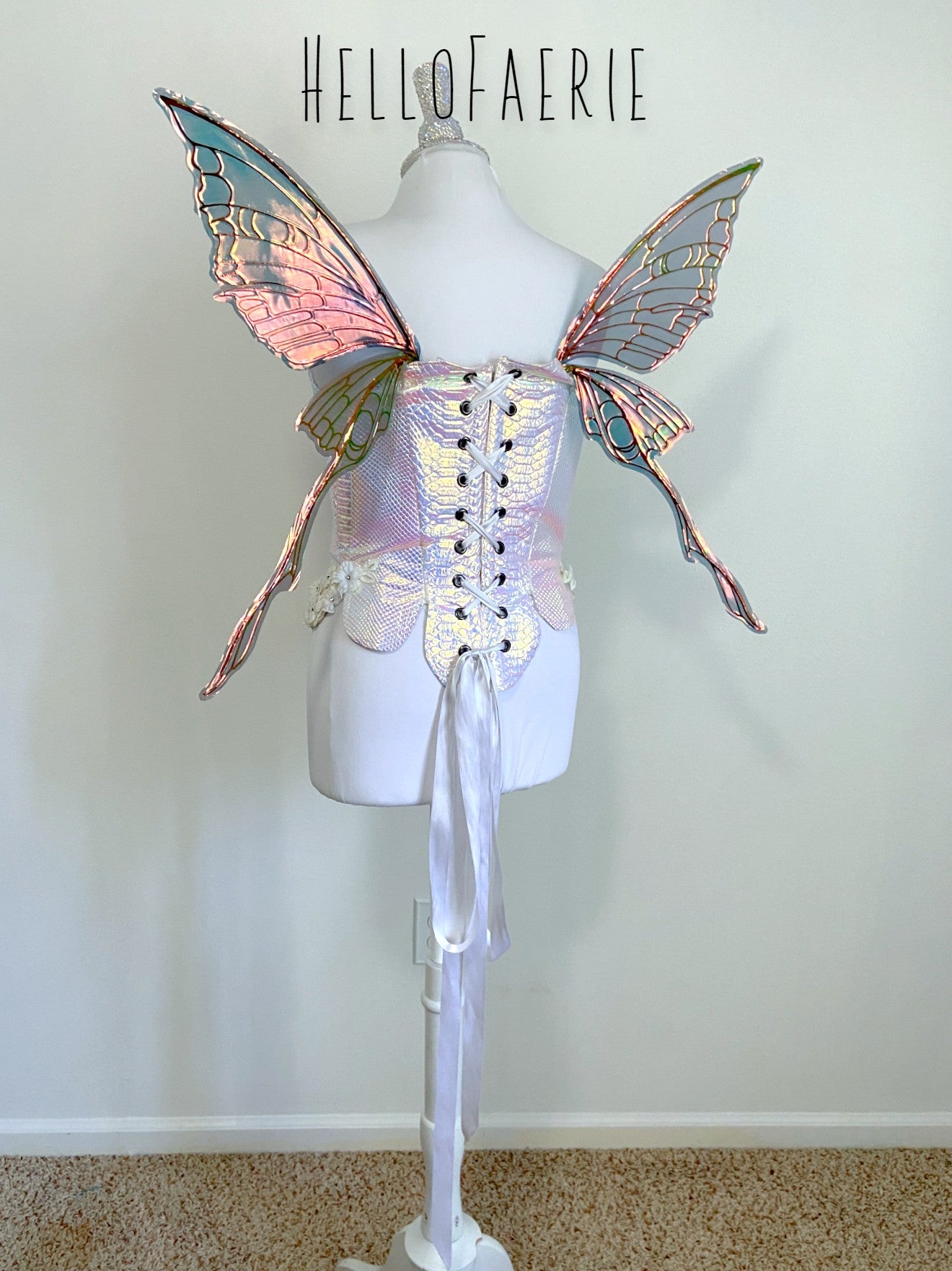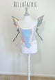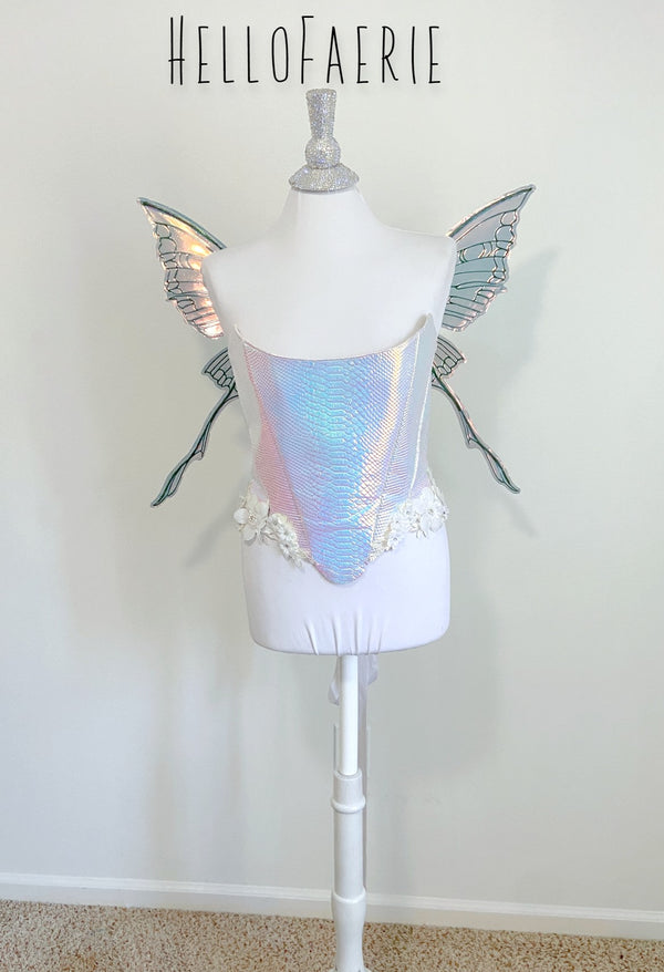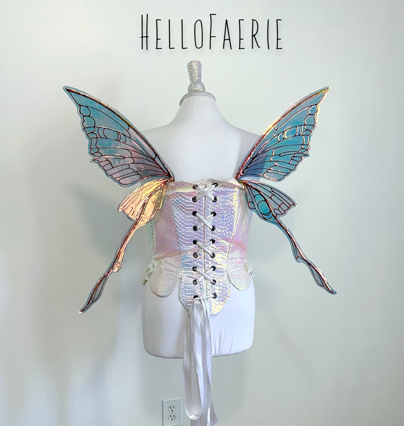 I am so proud and excited to rerelease my popular flexi fairy wings. Made of a durable plastic, they flex and bend without snapping. They are super light, and have the iridescent skin over them. These wings have a soft gorgeous flutter as you move and are the most unique wings I've ever seen.