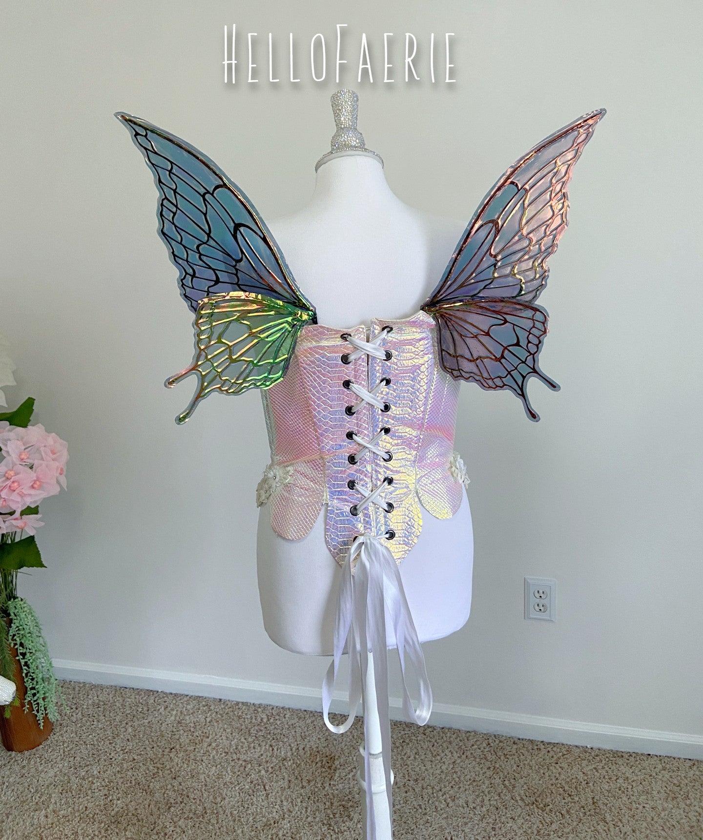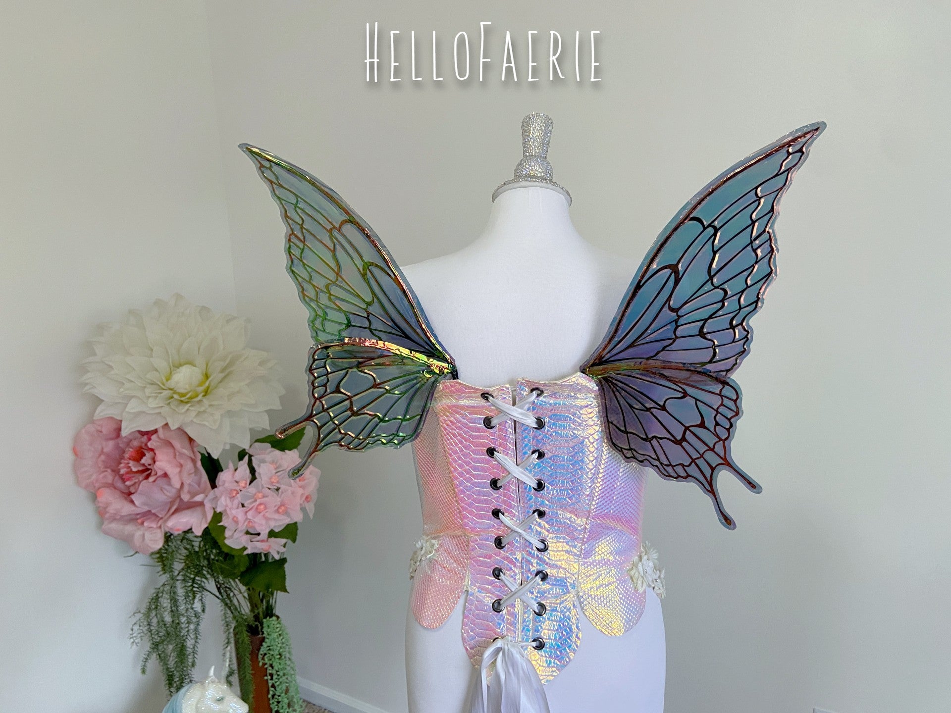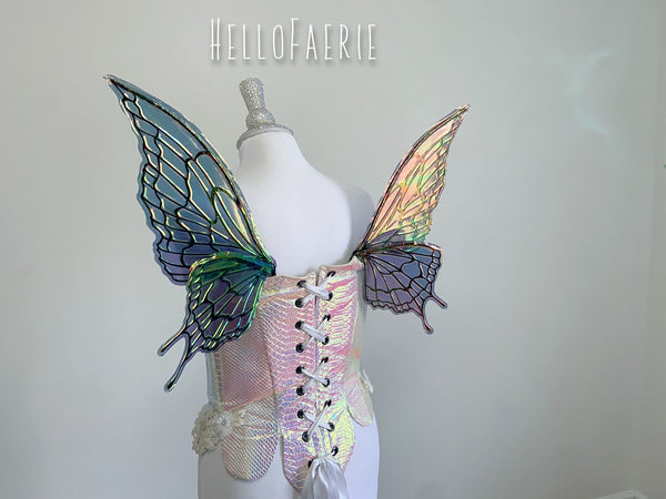 I am so proud and excited to rerelease my popular flexi fairy wings. Made of a durable plastic, they flex and bend without snapping. They are super light, and have the iridescent skin over them. These wings have a soft gorgeous flutter as you move and are the most unique wings I've ever seen.