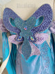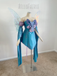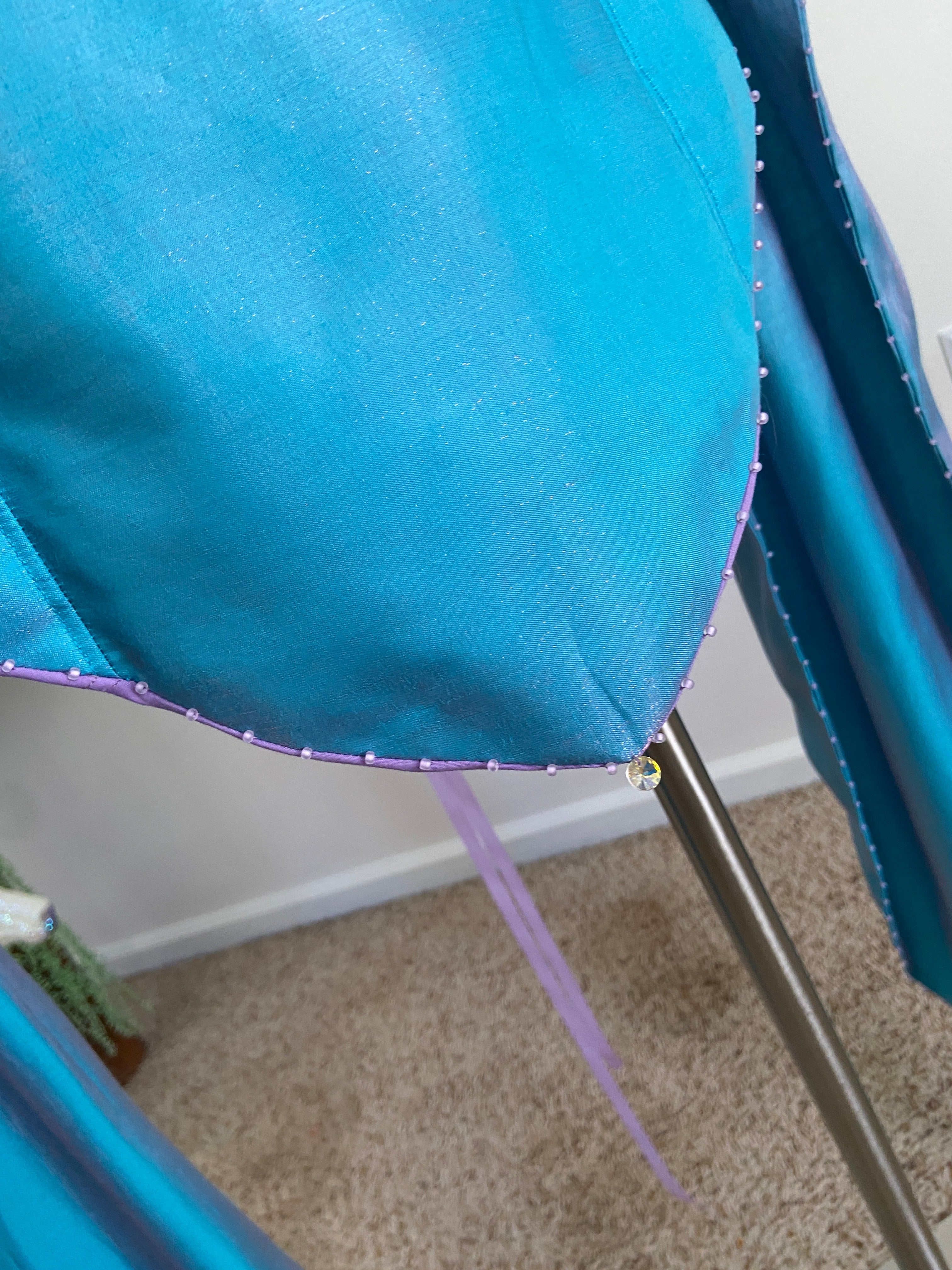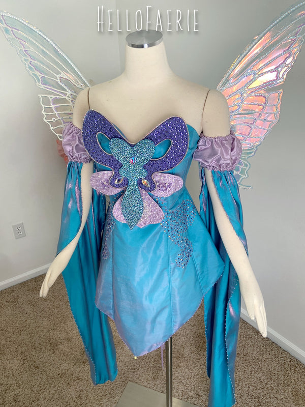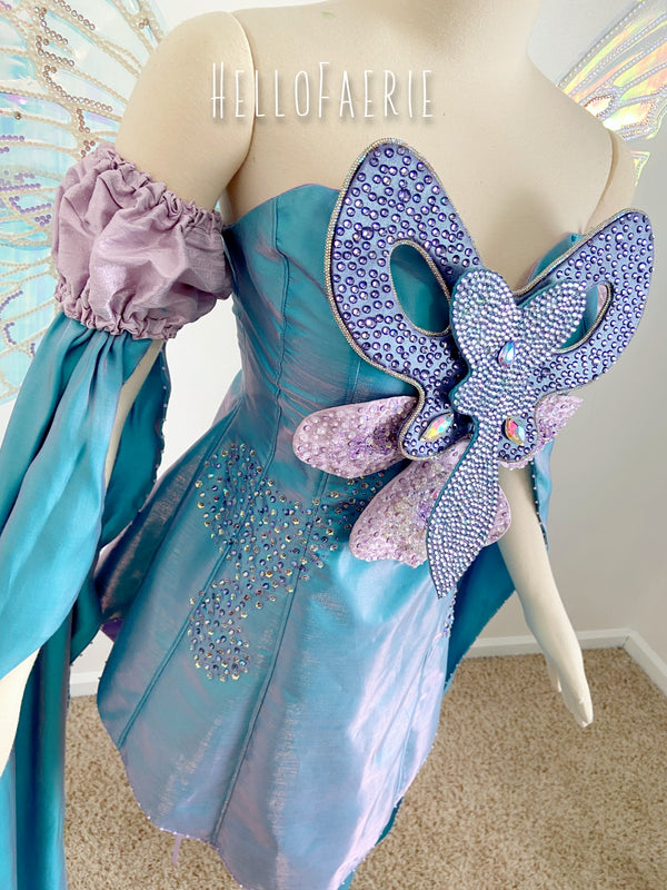 This is a 3 piece garment. This dress is made with a steel boned iridescent Blue to Purple cotton with cotton lining. The piece is adorned with a magical hand beaded and rhinestones silk and foam centerpiece. This hangs above a gorgeous layering of rhinestone and sequin shimmer. The purple stones on this are all Swarovski and have the most intense sparkle. The Sleeves are Dupioni silk and cotton. The entire piece is also trimmed in tiny glow in the dark glass beads. The sleeve drapes are lined and have the same beaded edge making this a one fun look. The entire piece is dripping in hand glued rhinestones. Its SOOOOO Winx Coded