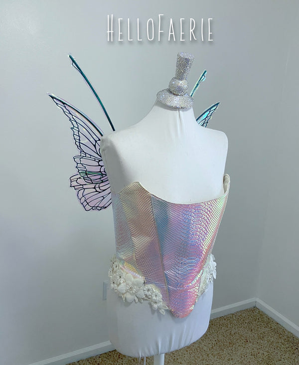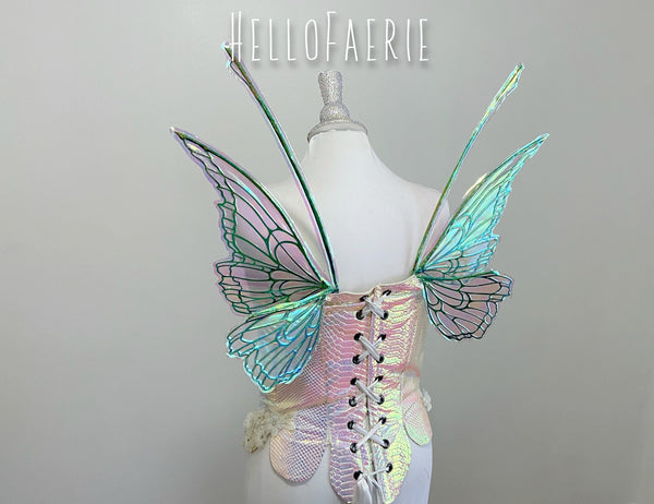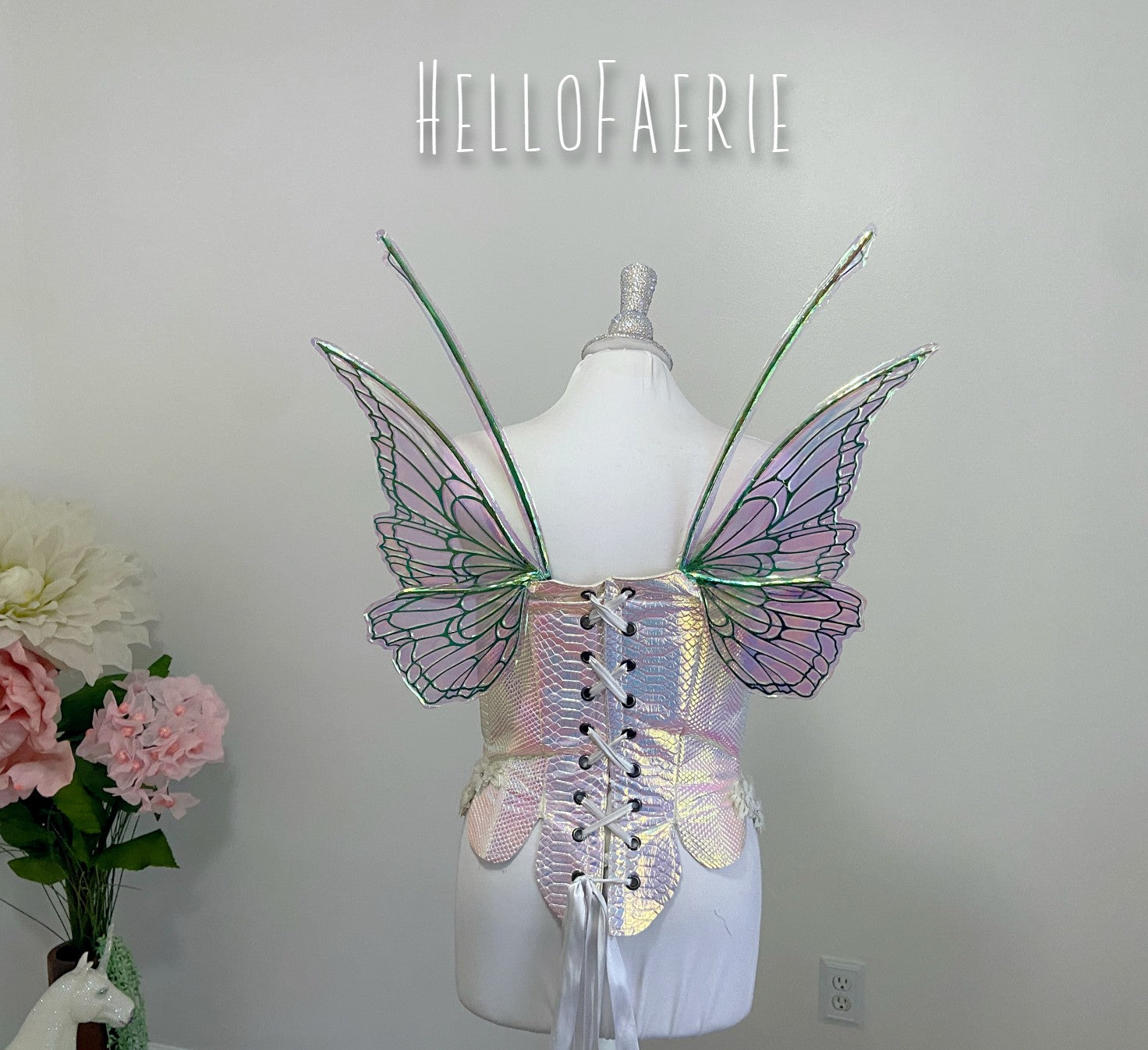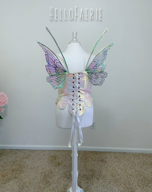 I am so proud and excited to rerelease my popular flexi fairy wings. Made of a durable plastic, they flex and bend without snapping. They are super light, and have the iridescent skin over them. These wings have a soft gorgeous flutter as you move and are the most unique wings I've ever seen.