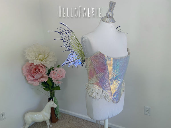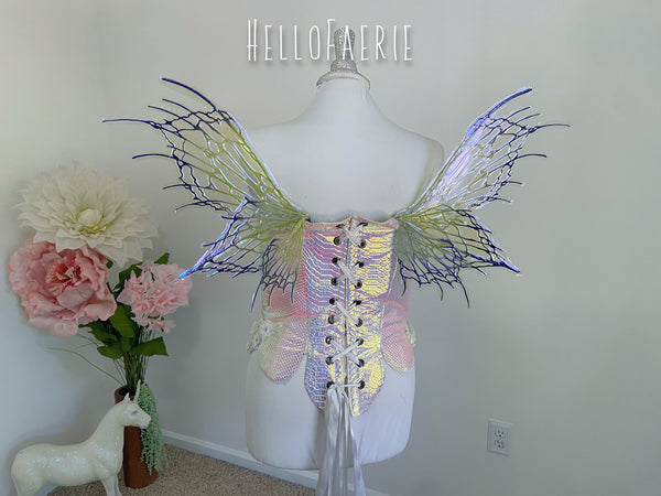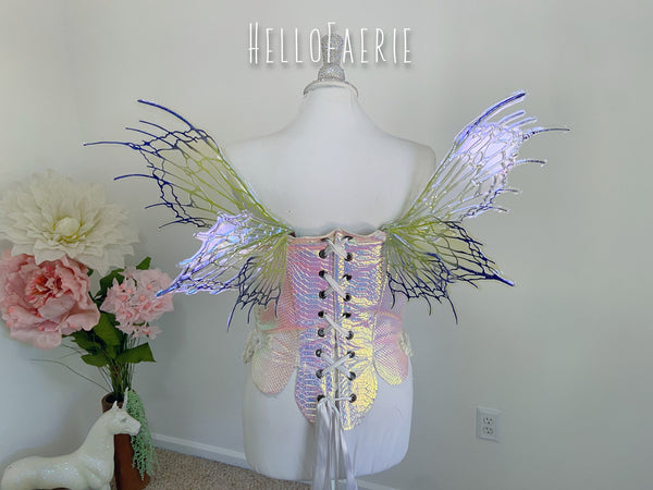 I am so proud and excited to rerelease my popular flexi fairy wings. Made of a durable plastic, they flex and bend without snapping. They are super light, and have multiple blue films over them. These wings have a soft gorgeous flutter as you move and are the most unique wings I've ever seen.