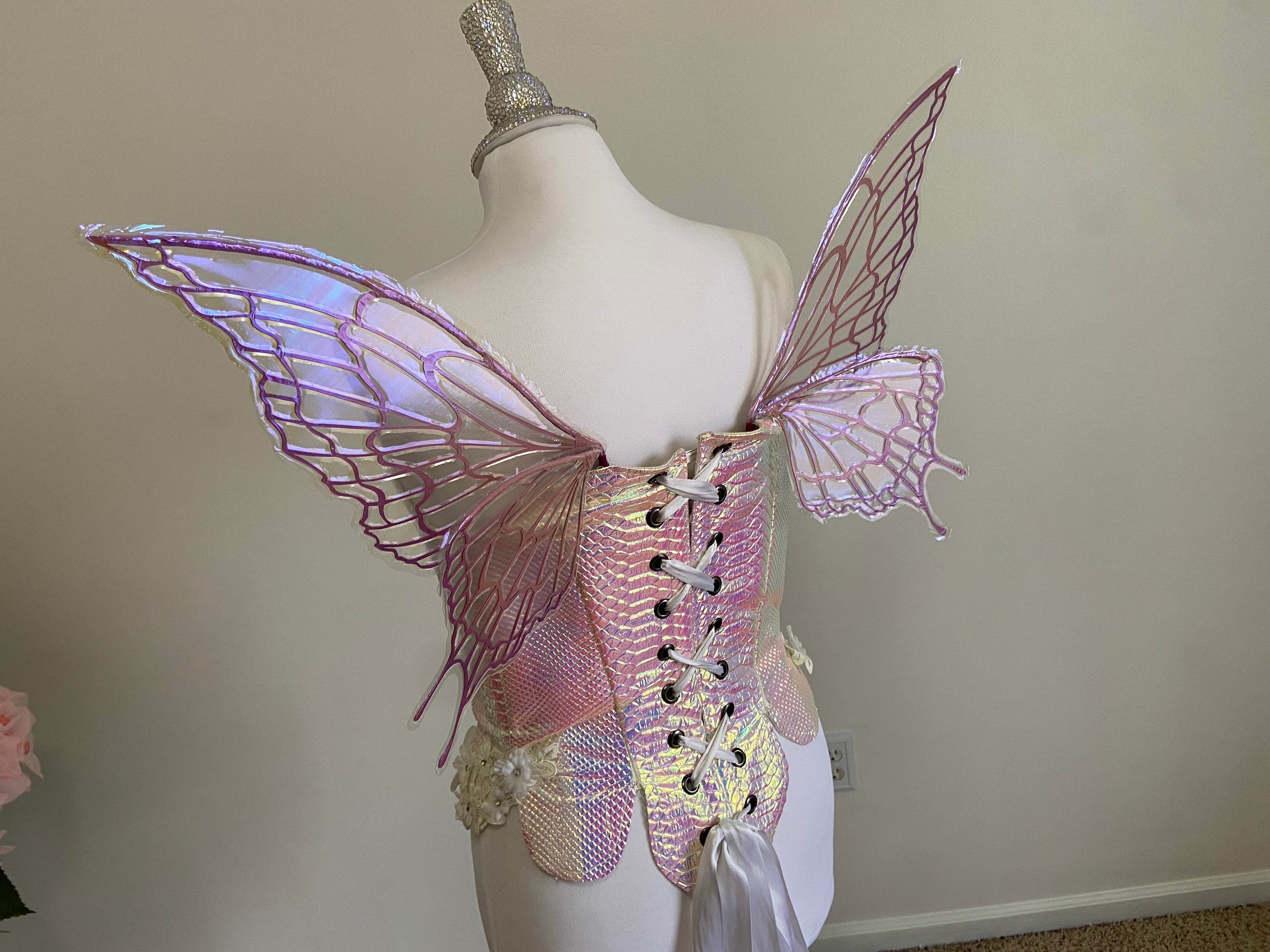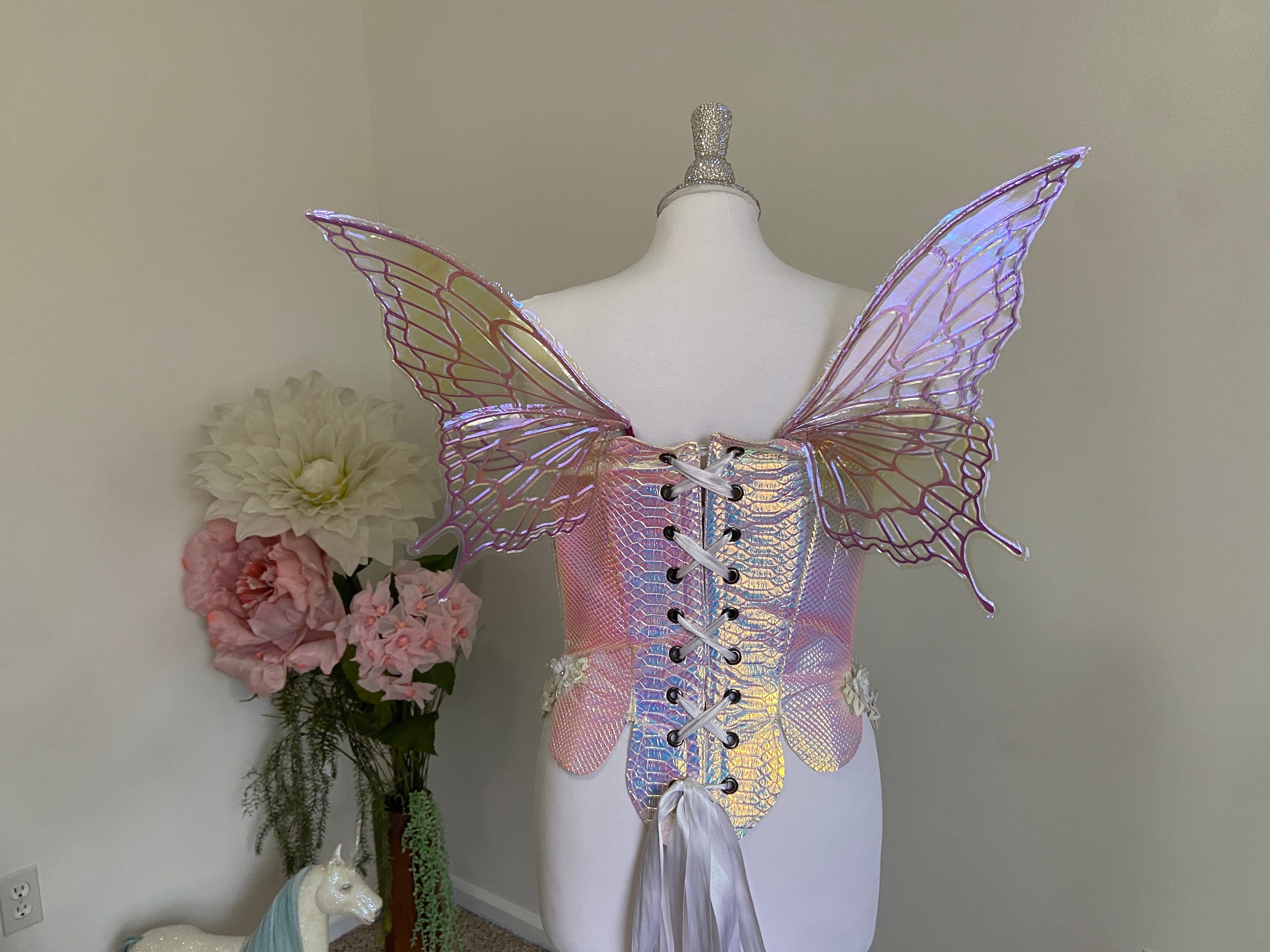 I am so proud and excited to rerelease my popular flexi fairy wings. Made of a durable plastic, they flex and bend without snapping. They are super light, and have the iridescent skin over them. These wings have a soft gorgeous flutter as you move and are the most unique wings I've ever seen.