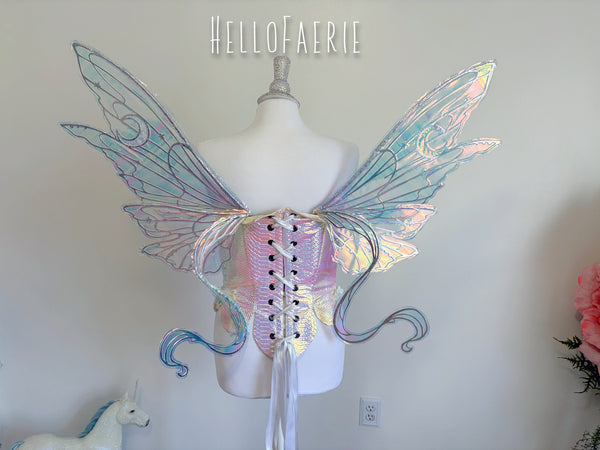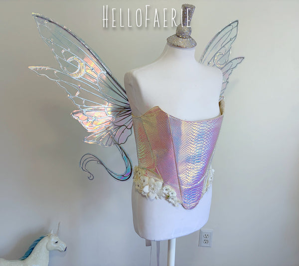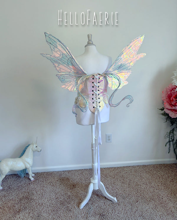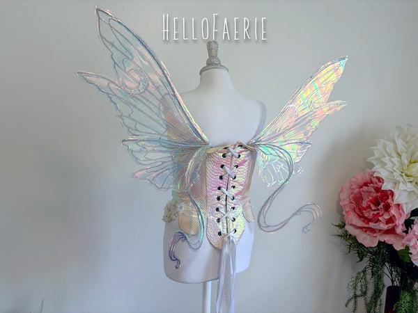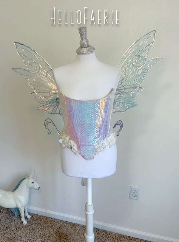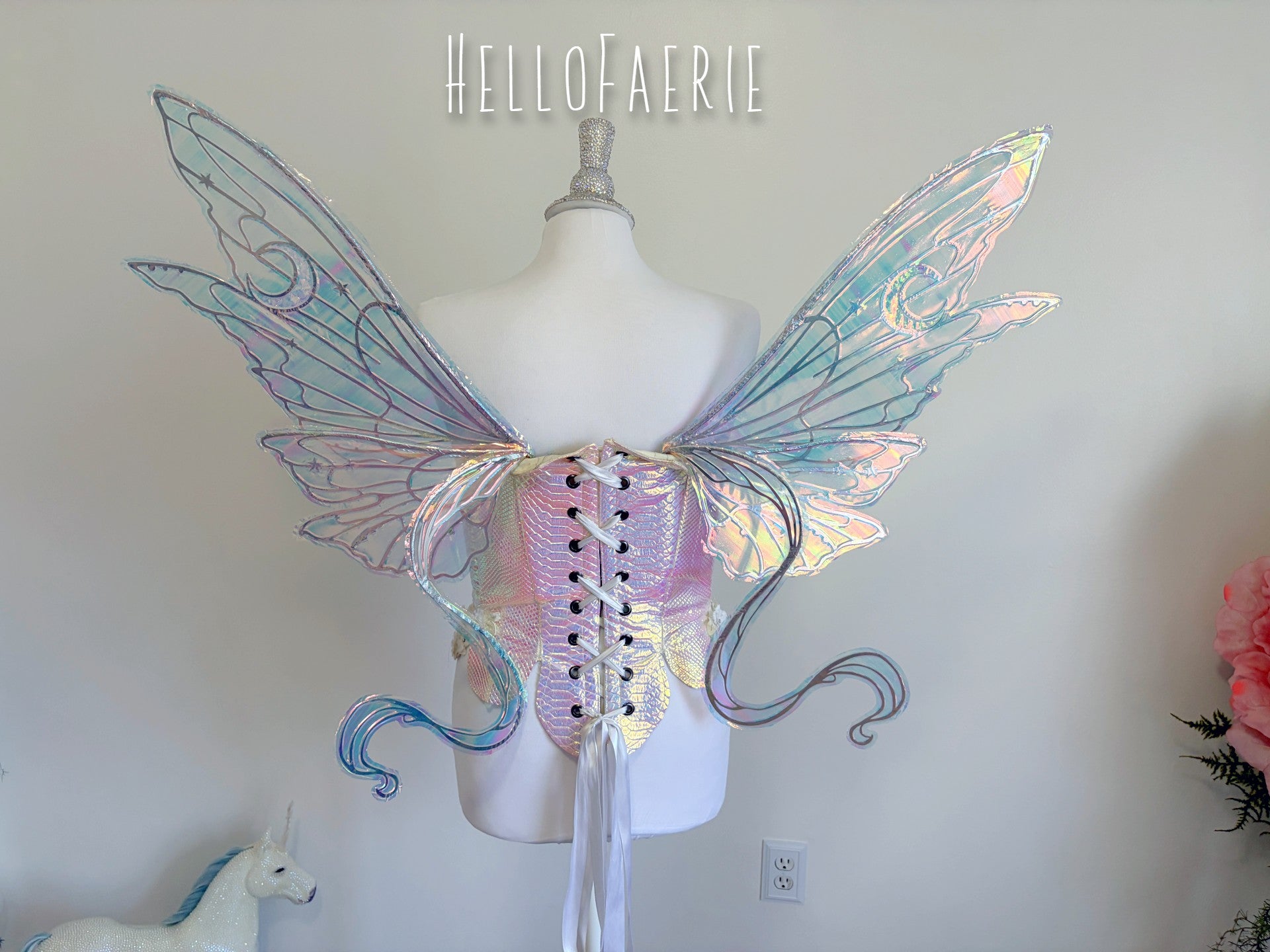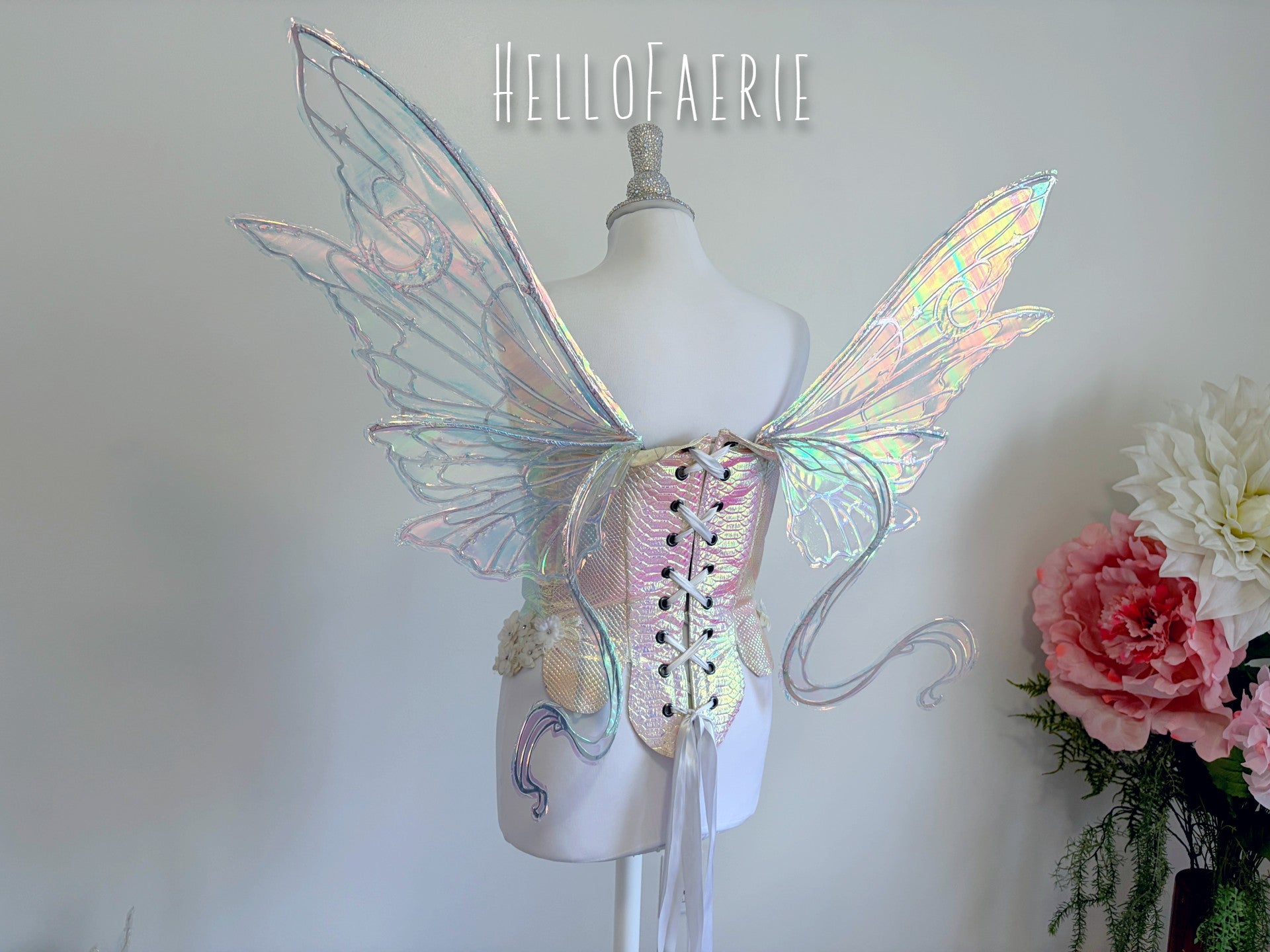 You can see even more videos and images of my wings on Instagram as well. <3 These wings are just over 2.5 in height and a 4 foot wingspan. They weigh in under a pound and are perfect for photo shoots and adventures. The wings are easy to wear, you just slide the base into the back of a corset, dress or tight fitting top. I am happy to add tie straps as well upon request.
